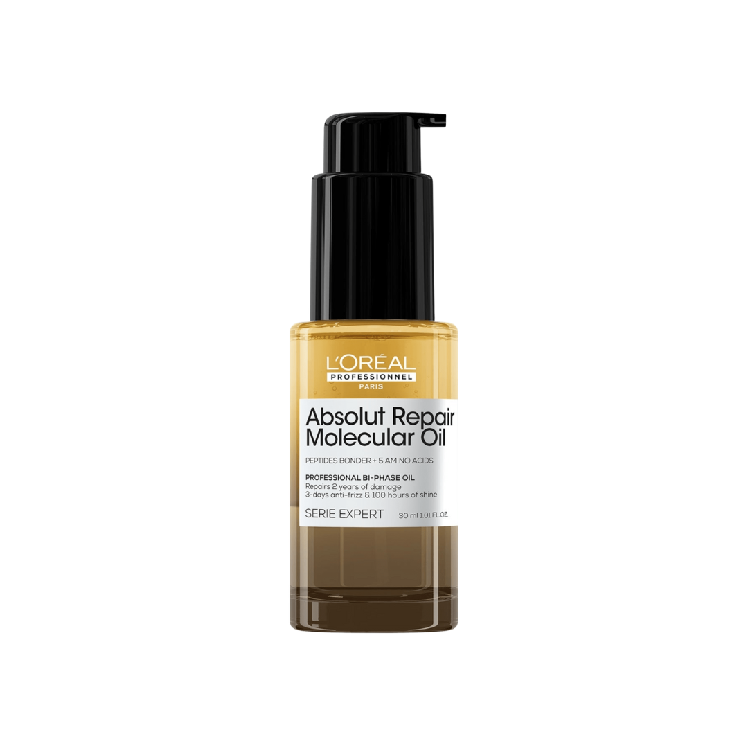 L’Oréal Professionnel Absolut Repair Molecular Bi-Phase Oil is a lightweight yet deeply restorative treatment designed to rebuild molecular bonds and enhance softness in damaged hair. Combining peptide bonding technology with nourishing lipids, it penetrates the hair fibre to strengthen from within while sealing the surface for instant smoothness and shine. The dual-phase formula delivers repair and protection without weight, leaving hair supple, glossy, and resilient.