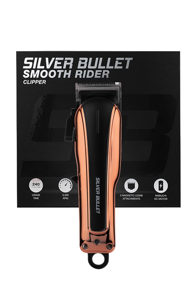 The Silver Bullet Smooth Rider Cordless Clipper combines superior cutting action with unmatched convenience. Designed with a high-performance 6,500 rpm Mabuchi DC motor from Japan, this clipper offers exceptional power and speed for flawless cuts. The 440C high-carbon stainless steel blade ensures long-lasting sharpness, while the ergonomic design provides comfort for extended use. The stylish rose gold finish adds a touch of elegance to this professional-grade tool.
